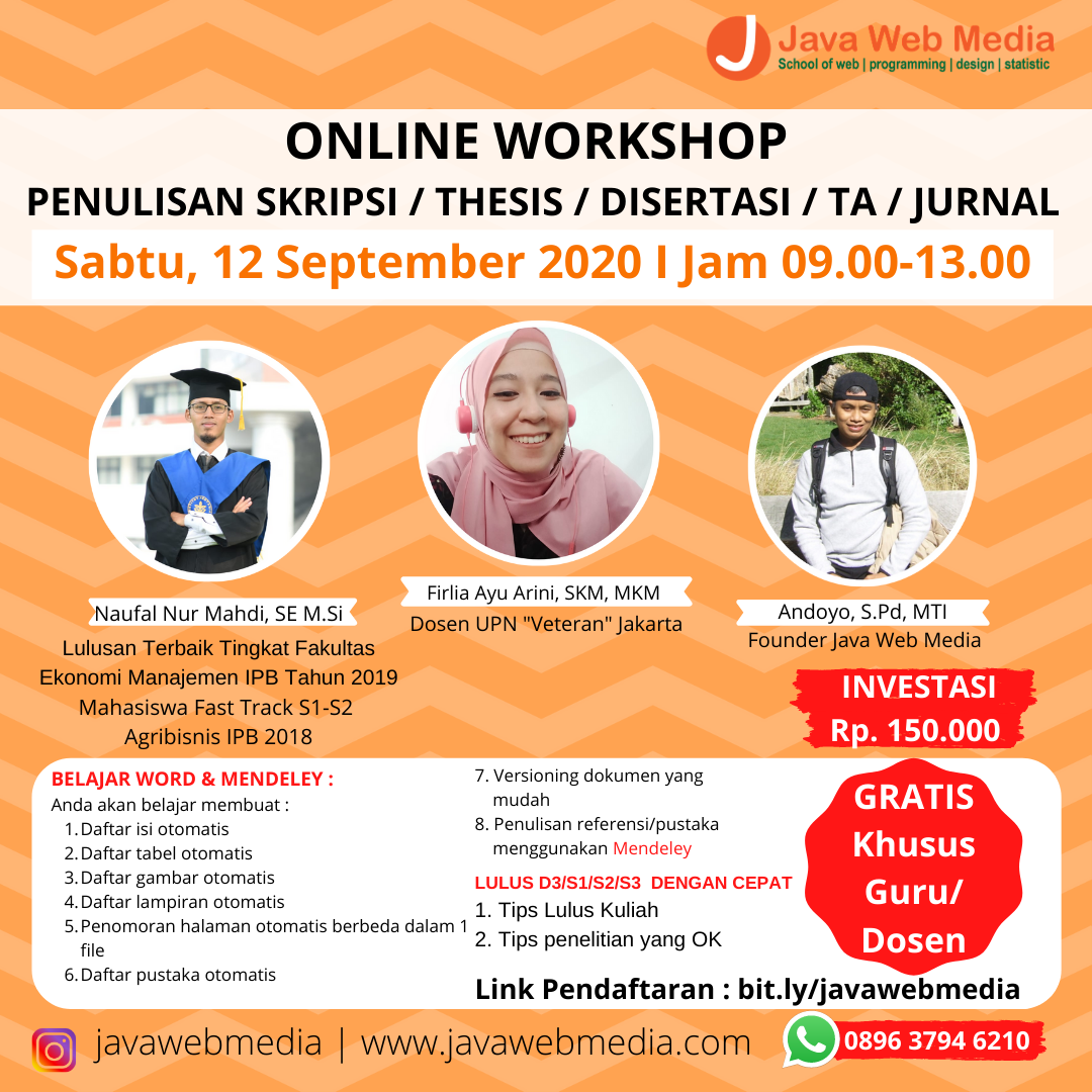 Java Web Media adalah lembaga kursus yang bergerak di bidang pendidikan khususnya kursus website, digital marketing, desain grafis dan statistik. Sampai saat ini Java Web Media sudah memiliki lulusan lebih dari 1200 orang dari berbagai status dan profesi mulai dari pelajar sekolah, mahasiswa, guru, dosen, staff profesional, freelancer, dll. Lulusan tidak hanya dari Indonesia tapi juga dari beberapa negara tetangga seperti New Zealand, Timor Leste dan Malaysia.